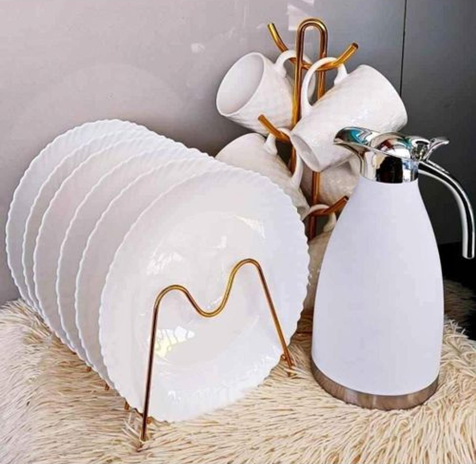 This is a breakfast set that consists of 13 pieces. This includes; 6 cups, 6 ceramic plates and a classy 2L flask. This makes it a great addition to your serving sets, whether for guests or family. Get a set (s) and have your meals in style. This breakfast set is an investment for your dinning table. You will enjoy taking your tea, coffee among others using this set. Ceremic is very durable material. Very pleasing to the eye. It brings love on the table. The cup is made of reinforced ceramics and can be directly heated in a microwave oven, safe and healthy.