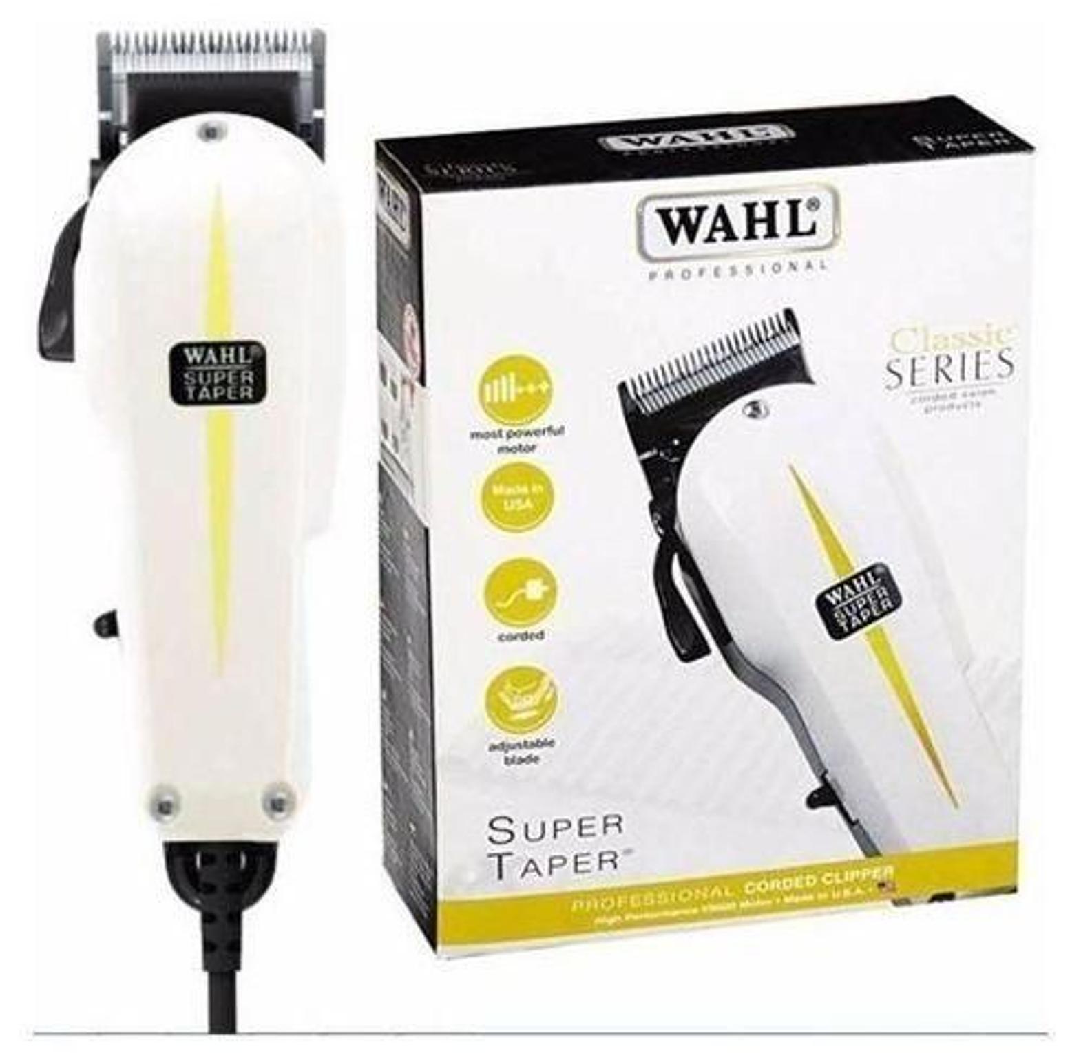The bestselling professional mains clipper. It s powerful, durable and quiet with a long lasting V5000 motor; it has a stylish, classic design and designed for the busy stylist or barber and ideal for all clipper work.. The clippers have precision-ground stainless steel blades that are engineered to the highest standard for the ultimate performance. This clipper kit includes 4 attachment combs in grades 1-4 (3-13 mm) and features a convenient thumb adjustable lever allowing taper and texture without changing the blade. To complete your kit we ve added the rechargeable Super trimmer, the perfect partner to the Wahl Super-Taper clipper. The Super trimmer is ideal for hair lines, sideburns, lining, facial hair, detail work and touch ups; it has 100 minutes operation time on full charge, is super quiet and light weigh for easy handling and has high precision snap on/off chrome plated blade to make cleaning and maintain your blade an ease. The super trimmer comes complete with a variable attachment comb offering cutting lengths from 3-6 mm. Complete kit includes mains operated clipper, rechargeable trimmer, 4 clipper attachment combs, variable trimmer attachment comb, trimmer charging stand, cleaning brush, blade oil, blade guard and instructions.